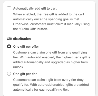 A: The same cart spending counts toward both offers independently. If a customer spends enough to meet both thresholds, both gifts become available. The widget shows both offers, and the customer can claim both. With auto-add enabled, both gifts are added automatically for tiered offers. For non-tiered offers, the offer with the higher spending threshold is auto-added first; the customer can still claim the other gift manually.
