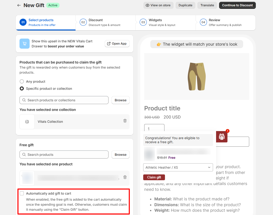 A: Not by default. If you would like the gift to be automatically added when its requirements are met, enable the option "Automatically add gift to cart" while creating the Gift upsell offer in Vitals: