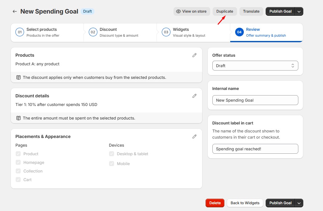 Due to evolving Shopify guidelines, our Goal upsell offer has recently been adjusted to align more closely with how Shopify’s Order-type discounts work. Now, the discount is triggered once the order total meets the set amount, regardless of which products are added to the cart.