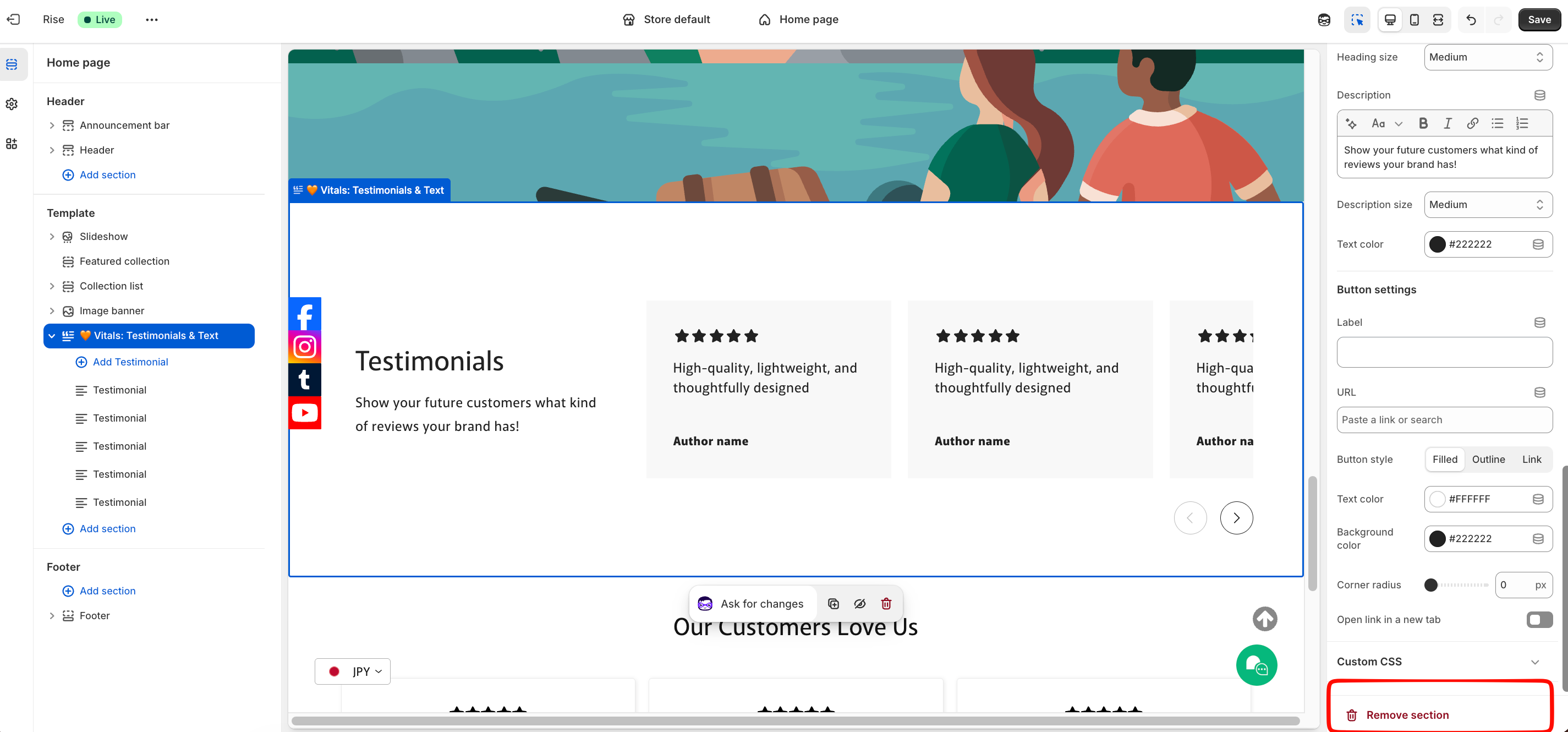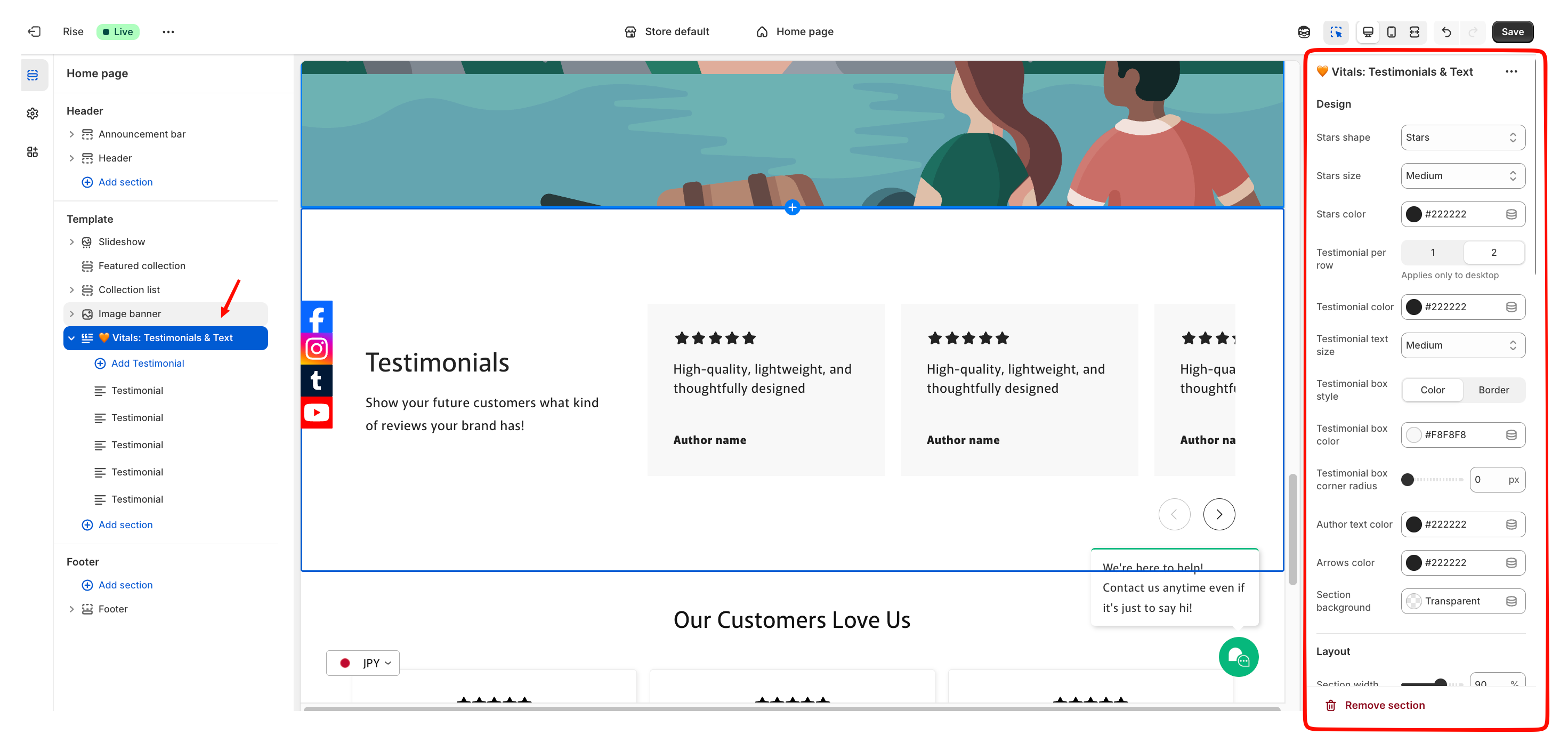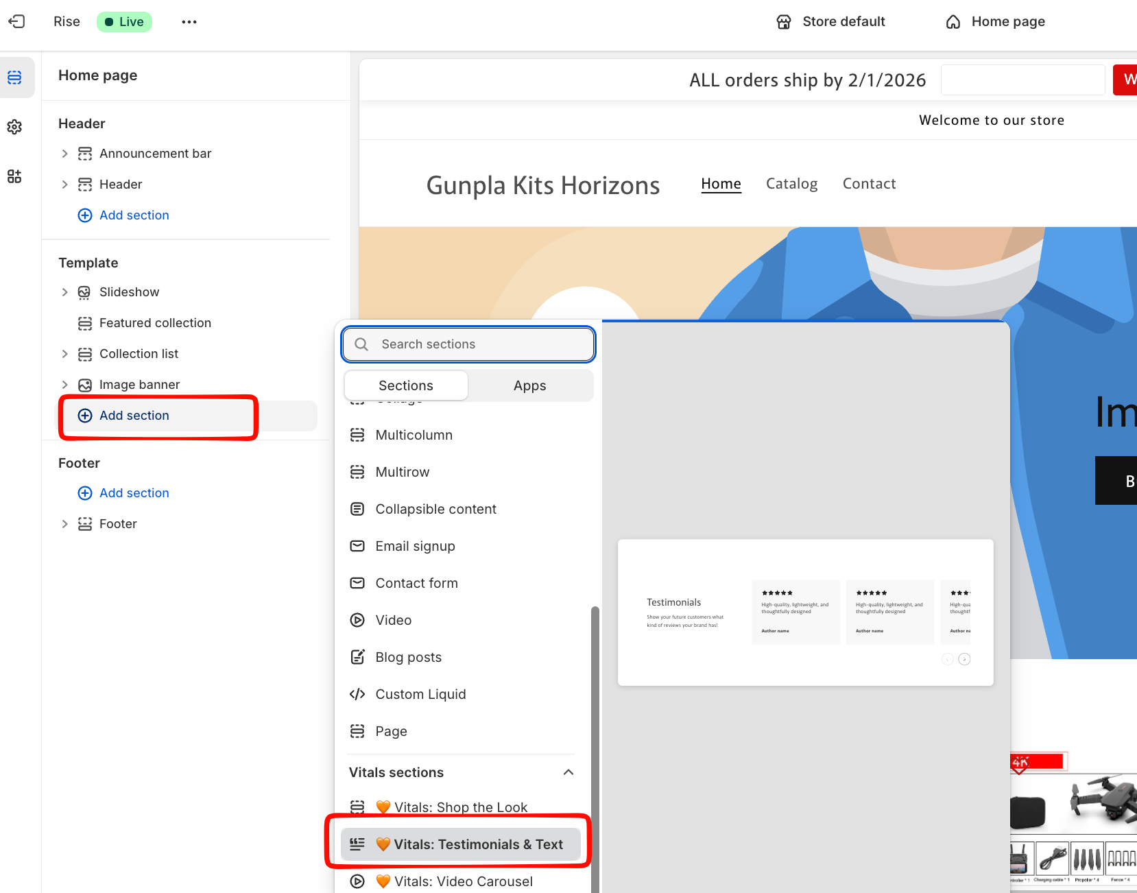 Once you have successfully installed the theme section, you can now go to the Shopify Theme Editor and insert it by clicking Add section > Vitals: Testimonials & Text.
