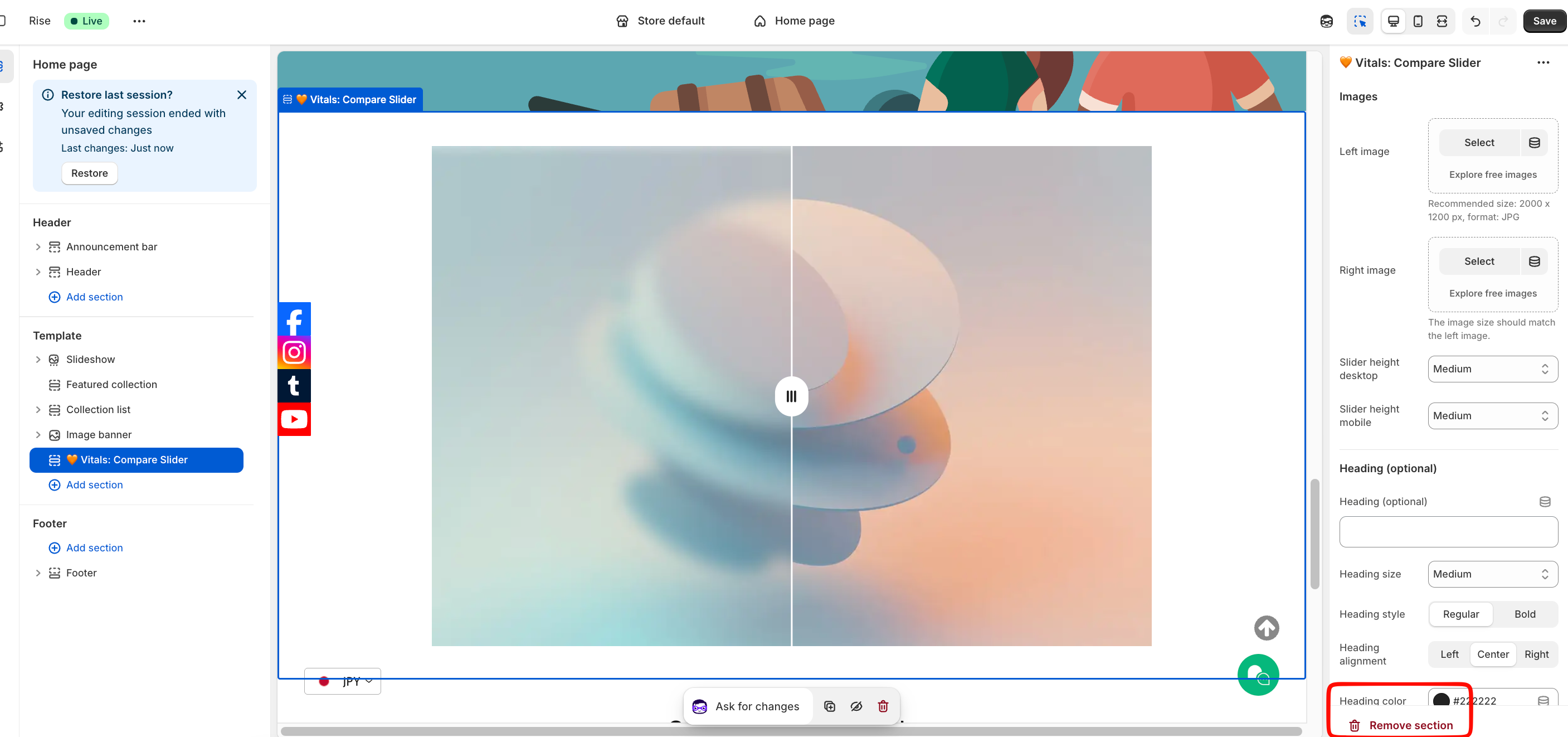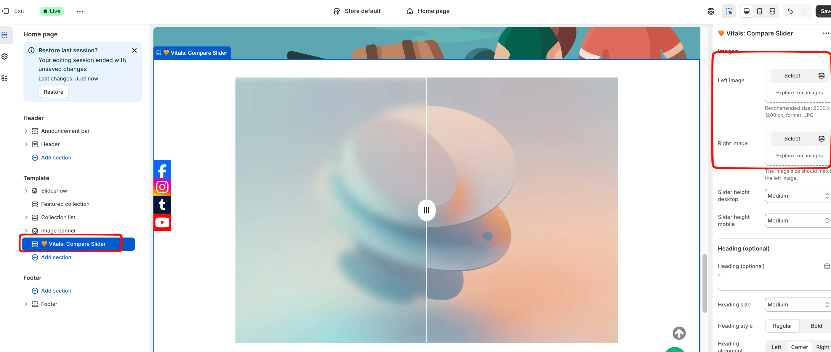 For this theme section to work effectively, you need to provide two images (left and right) that will provide the Comparison behavior.