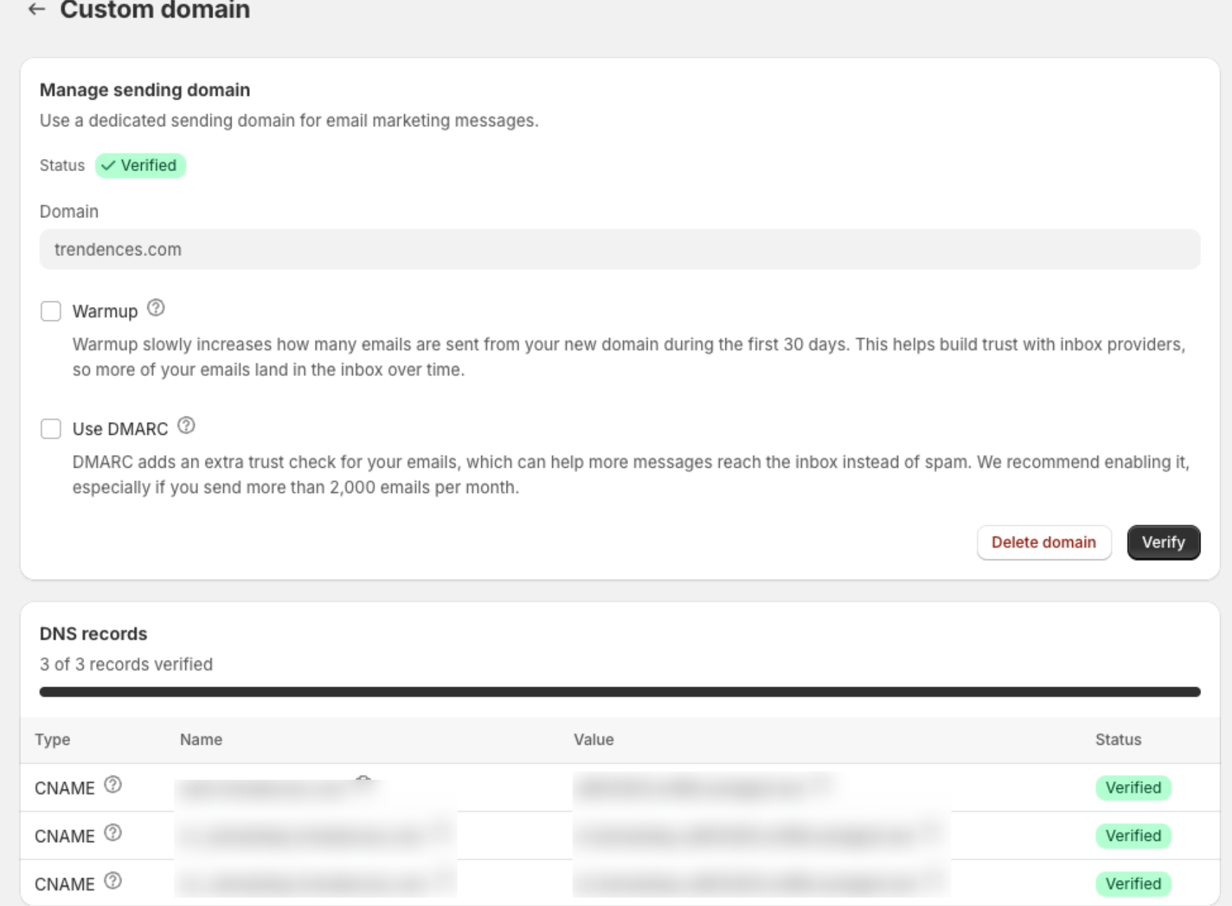 Once all records are confirmed, your domain status will change to Verified.