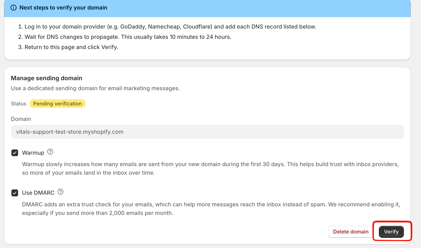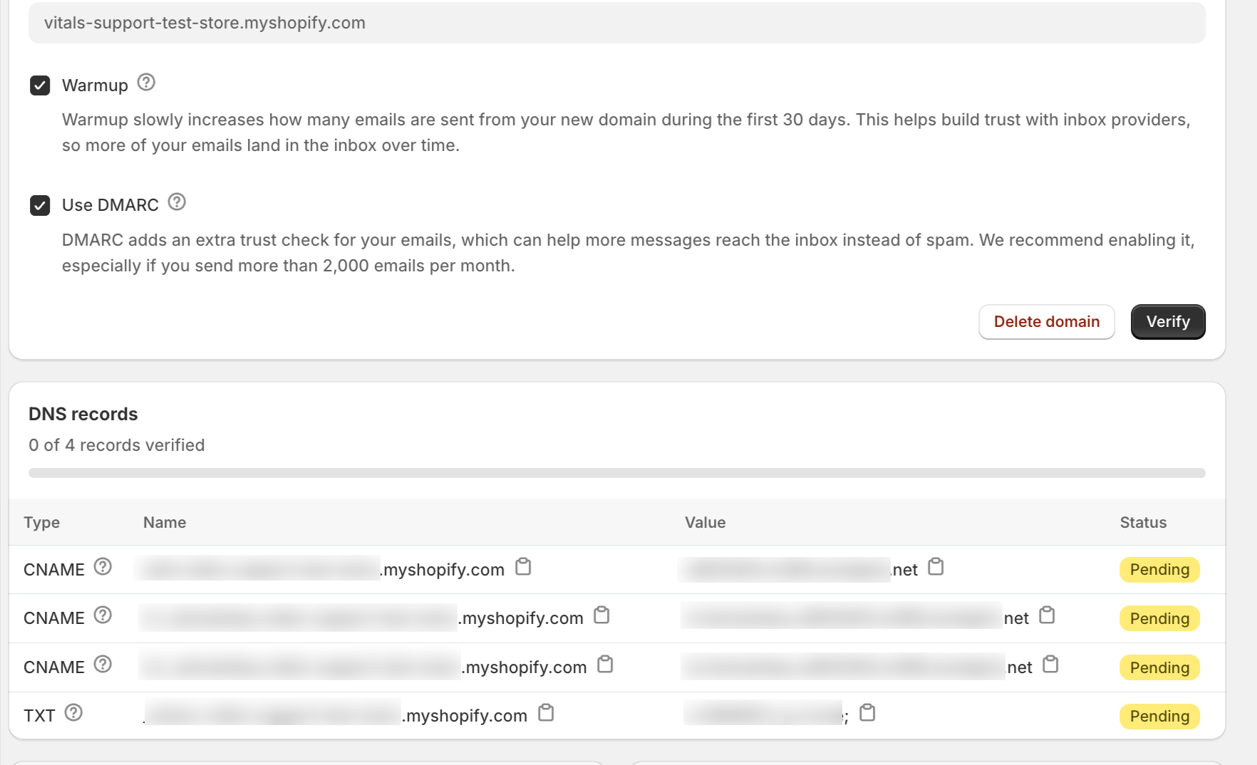 - Pending verification – DNS records not yet detected