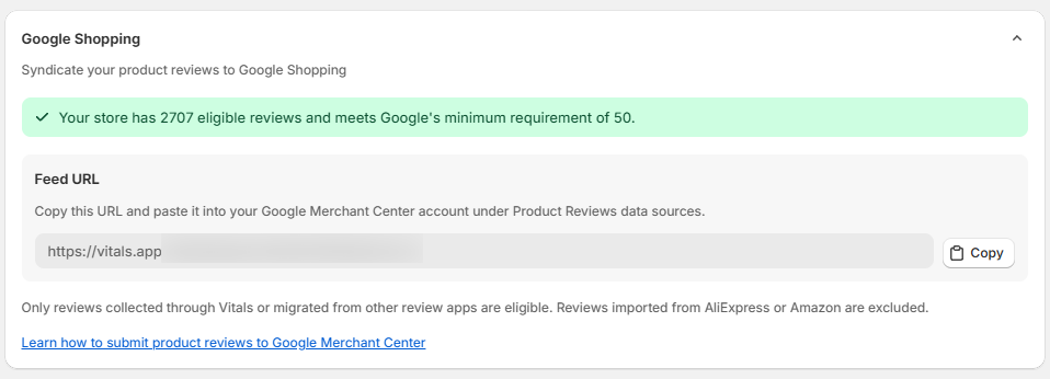 Focus on collecting more reviews through Vitals using email requests, on-site review forms, and post-purchase flows. The feed URL will be ready for you as soon as you reach 50 eligible reviews.